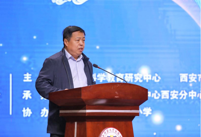 西安市教育科学研究院教育质量评估与监测研究部副张建武主任介绍了“陕西省科学教育研究中心西安分中心”和“西安市科学教育和科技创新研究中心”的主要工作规划,明确了中心的工作职能是围绕培养基础教育阶段学生的科学素养、科学思维、创新意识、实践能力等方面,对地区学校、教师、教科研单位的教育观念、科研理念、人才培养目标、人才培养过程、人才培养方式方法等给予引领性带动、指导和支持。通过组织筹备实施相关学科的教师创新实践能力提升培训,达到使教师教育理念和教学方式得到创新发展提升。