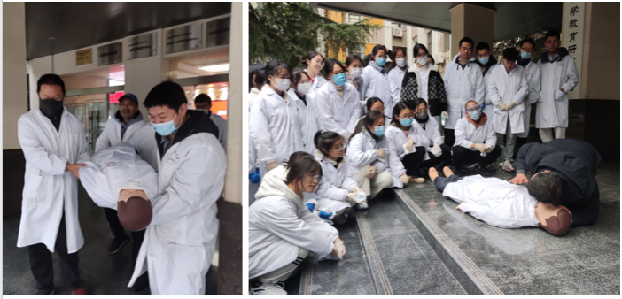 现场模拟教学七楼5层西侧化学实验室发生“火情”,现场浓烟滚滚,火势迅速向各楼层蔓延,并有人员受伤,情况危急。疏散引导组使用“闪光棒”指挥楼内师生用湿毛巾捂住口鼻,低头弯腰呈一路纵队有序逃离;疏散检查组逐层排查室内人员,清点人员数量,确保无滞留人员;报警组模拟拨打火警电话,汇报火情并进行事故上报,寻求救援;应急救助组迅速将“伤员”救援至开阔地带,在“黄金四分钟”内为伤者实施有效心肺复苏,为AED(自动体外除颤器)和120救护车的到来争取时间,提高抢救效率。