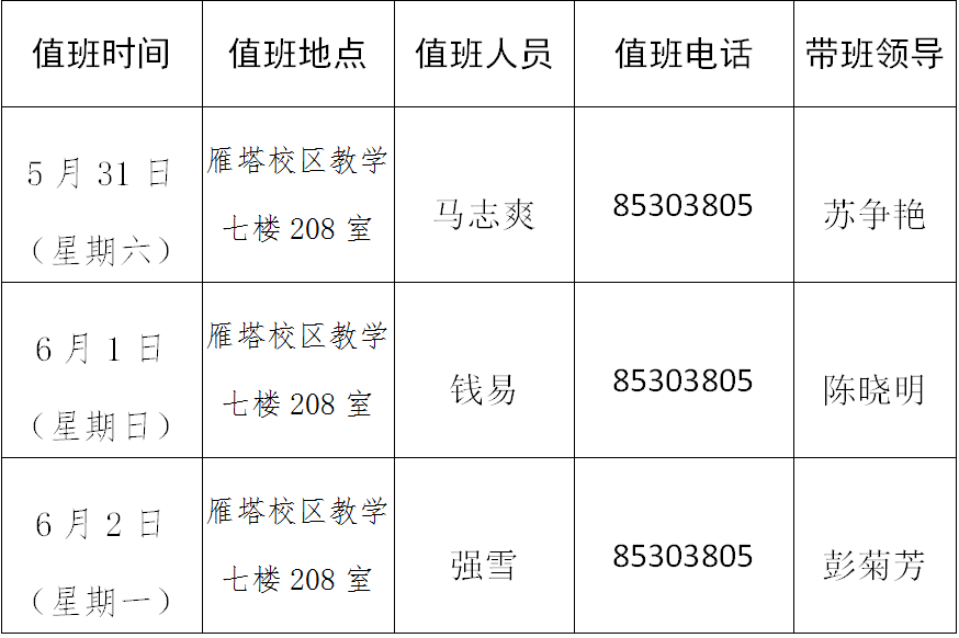 2.值班期间如遇有紧急、重要事项或突发事件,应立即联系带班领导并向学校总值班室(校务楼110室,85310005)报告并妥善处置;